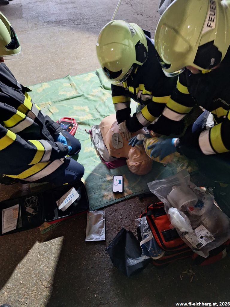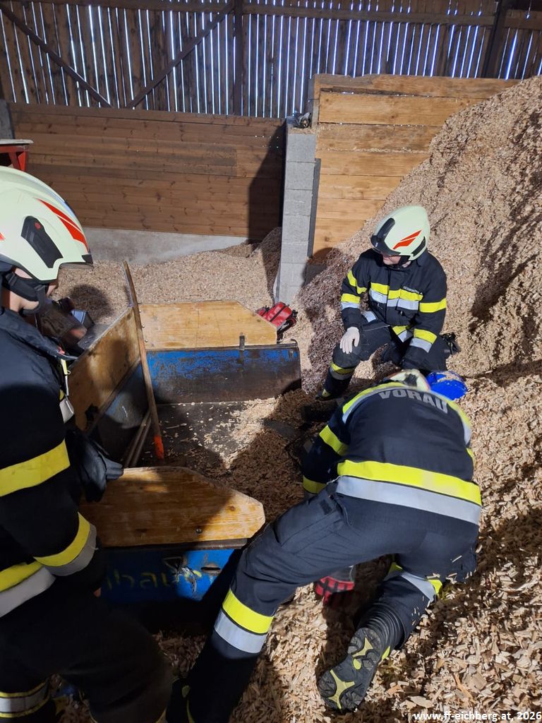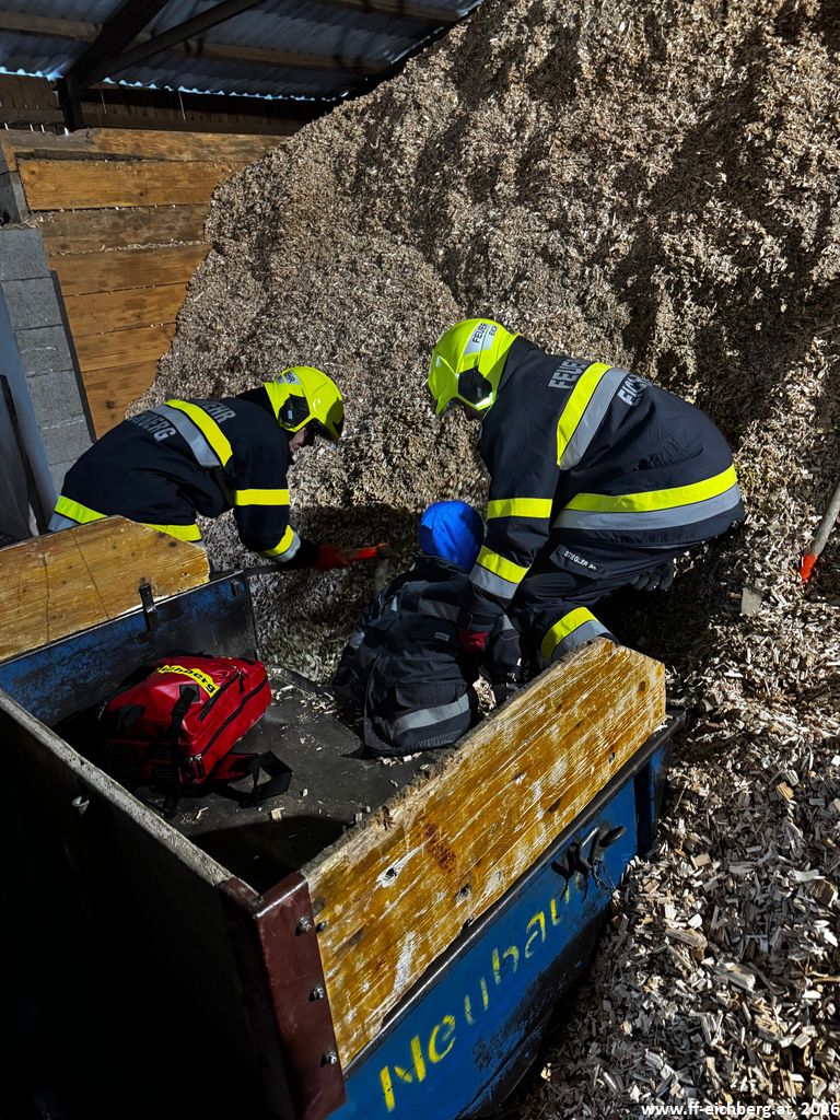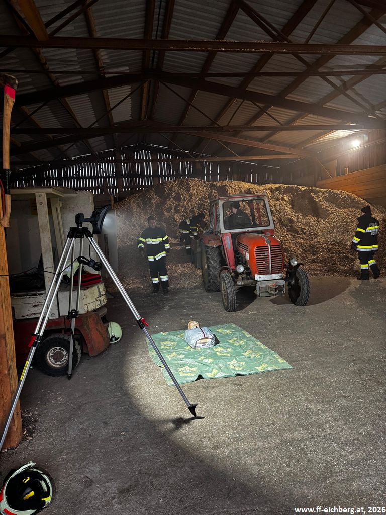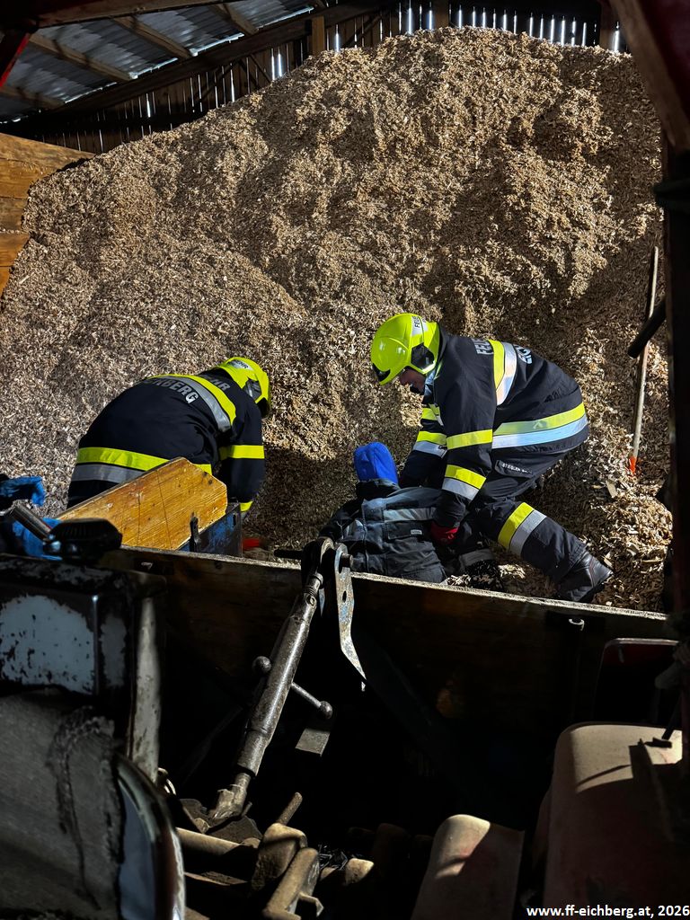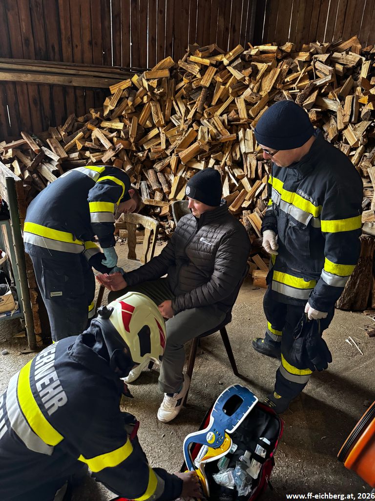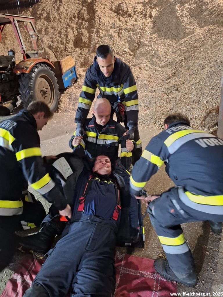 Bei der ersten Lage handelte es sich um eine Crash-Rettung einer verunfallten, regungslosen Person, die bei Hackguttransportarbeiten von einem Traktor eingeklemmt wurde. Nach der Rettung wurde umgehend mit der Reanimation mittels Herzdruckmassage und Defibrillator begonnen.